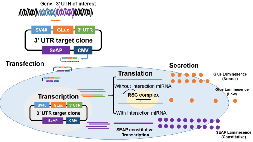 利用荧光素酶报告系统体外验证miRNA潜在靶基因。miRNAs 与靶基因的3' UTR区域特异结合后调节靶基因的表达。当3' UTR靶标序列融合在一个荧光素酶报告基因下游并在体外表达时,miRNA通过与下游3' UTR特异结合从而调节荧光素酶的表达。最后,通过分析荧光素酶的活性,间接了解miRNA的靶标调控作用和特异性。