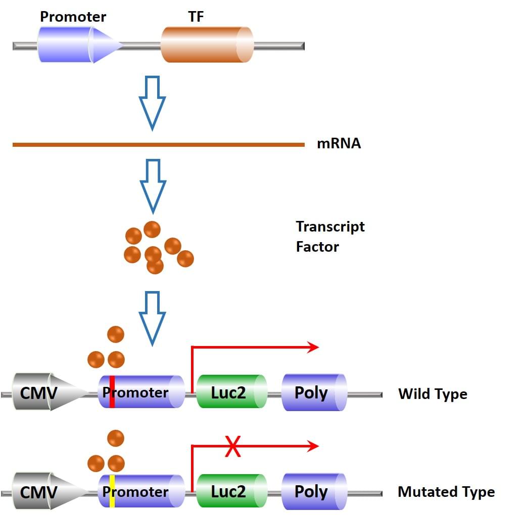 转录因子是一种具有特殊结构、行使调控基因表达功能的蛋白质分子,也称为反式作用因子。某些转录因子仅与其靶启动子中的特异顺序结合,这些特异性的序列被称为顺式因子。转录因子的DNA结合域和顺式因子实现相互结合,从而对基因的表达起抑制或增强的作用。荧光素酶报告基因实验是检测这类转录因子和其靶启动子中的特异顺序结合的重要手段。