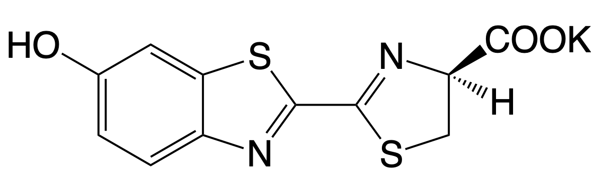 D-Luciferin 是荧光素酶(Luciferase)的常用底物,普遍用于整个生物技术领域,特别是体内活体成像技术。在ATP 和荧光素酶的作用下,荧光素能够被氧化,并且在 560nm 检测到其化学发光。Luciferin 由 luc 基因编码,该基因作为报告基因在多种细胞中存在。由于化学发光的低背景性,luc 基因在很低的表达水平下就可以被监测到。此外,荧光素/荧光素酶被用来测量 10-15摩尔量的 ATP