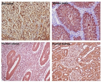 Immunohistochemical analysis of paraffin-embedded (1) Rat colon; (2) Mouse testis; (3) Human uterus; (4) Human kidney, using GAPDH Antibody .