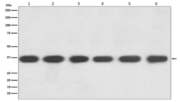Western blot analysis of GAPDH expression in (1) Hela cell lysate; (2)Jurkat cell lysate; (3)Mouse kidney lysate; (4) Mouse spleen lysate; (5) RAW 264.7 cell lysate; (6) Rat brain lysate with GAPDH Antibody.