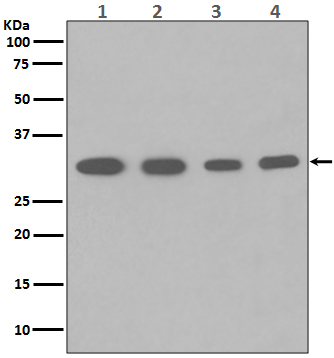 Western blot analysis of PCNA expression in (1) Hela cell lysate; (2) HepG2 whole cell lysate; (3) U937 whole cell lysate; (4) Mouse spleen lysate with PCNA Antibody.